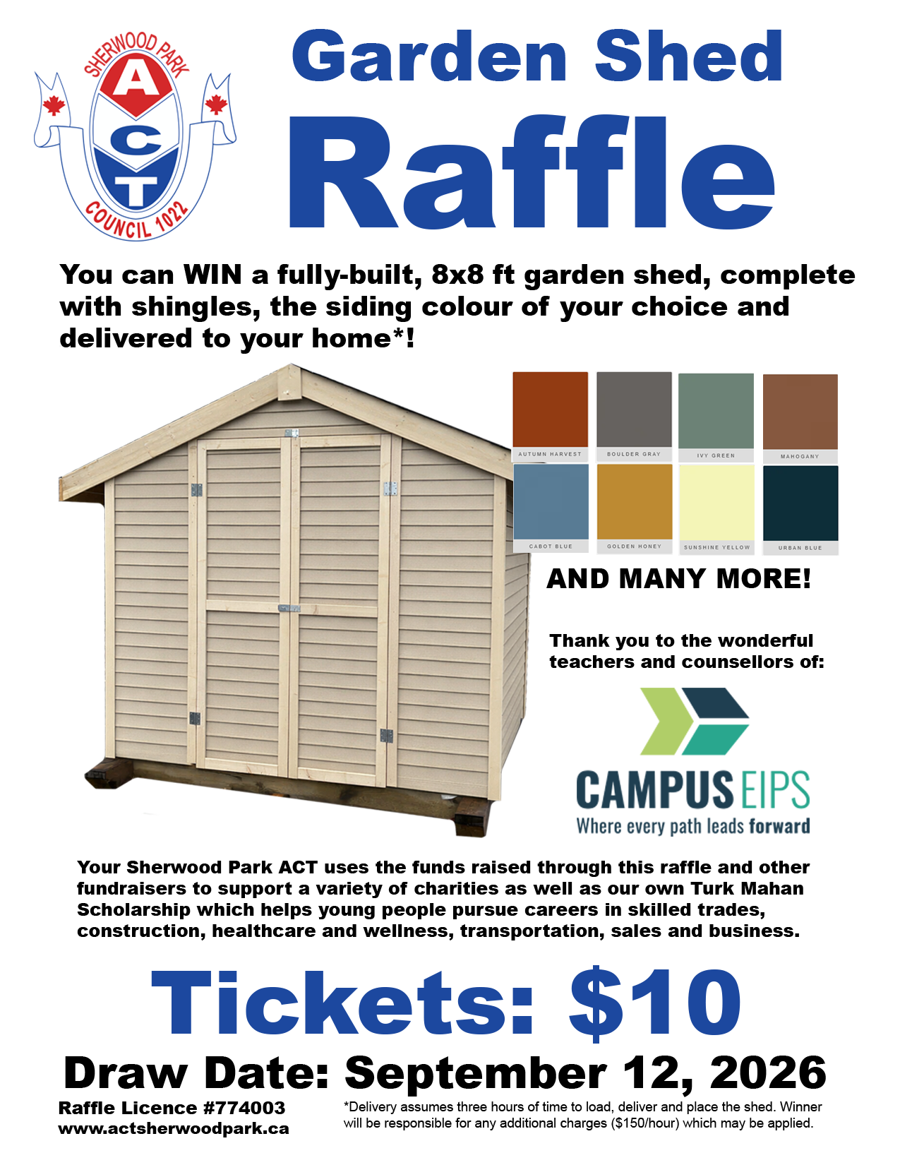 Your Sherwood Park ACT uses the funds raised through this raffle and other fundraisers to support a variety of charities as well as our own Turk Mahan Scholarship which helps young people pursue careers in skilled trades, construction, healthcare and wellness, transportation, sales and business.